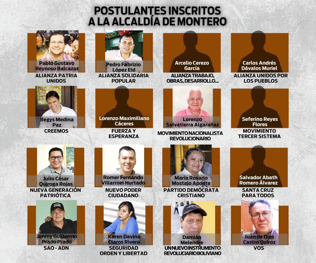 La carrera por la Alcaldía de Montero se perfila inédita: 16 precandidatos están la lista de inscritos a la espera de que sus candidaturas se habiliten para disputarse el cargo de alcalde. De todos ellos, 15 incursionan por primera vez en la arena política partidaria en busca de un cargo electivo mediante el voto popular, siendo el único con trayectoria el actual alcalde, Regus medina, que apuesta por la continuidad y busca renovar su mandato frente a un abanico de rostros nuevos.